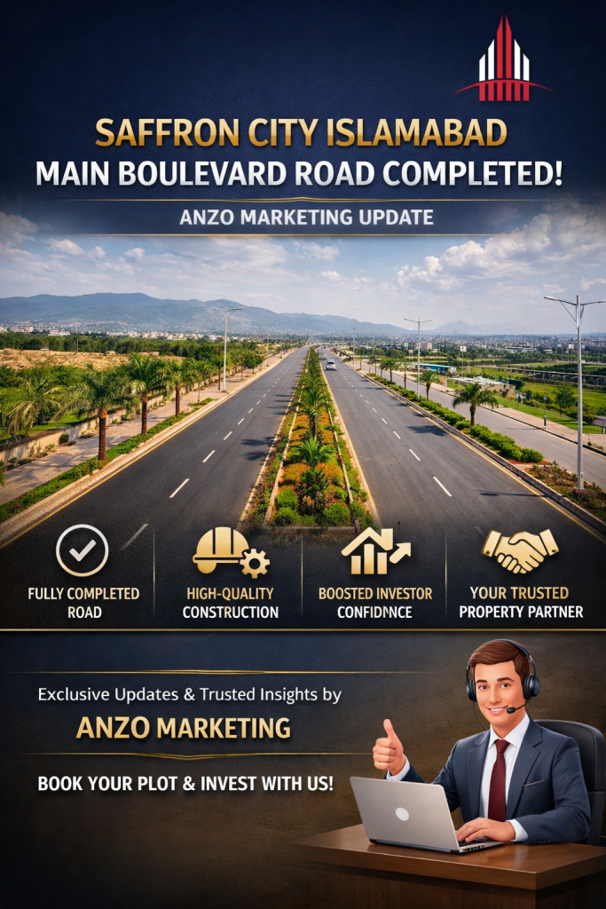Anzo Marketing is proud to announce a major development update for Saffron City Islamabad with the successful completion of its Main Boulevard Road. As a